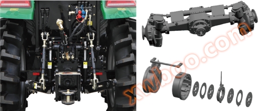 基本型配置:常発エンジン、独立操作双作用クラッチ、12+12同期機シフト、分体PTO軸は8-540/760、前高花9.5-24、後高花14.9-30、立式二気筒強圧リフト、二組油圧出力、可変牽引装置付き、エアコン運転室、前配重160 KG、1.55 mホイールベース、多モード調整、衛星測位。