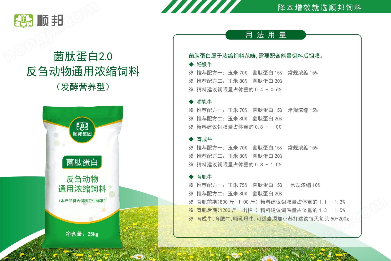 順邦菌ペプチド蛋白質は価格が合理的で、性価比が高く、一部の精料補充料の代わりに飼料コストを下げることができ、同時に大量のビタミンと微量元素を豊富に含み、特に雌牛によく現れる繁殖障害及び飼育コストの高い問題を改善した。